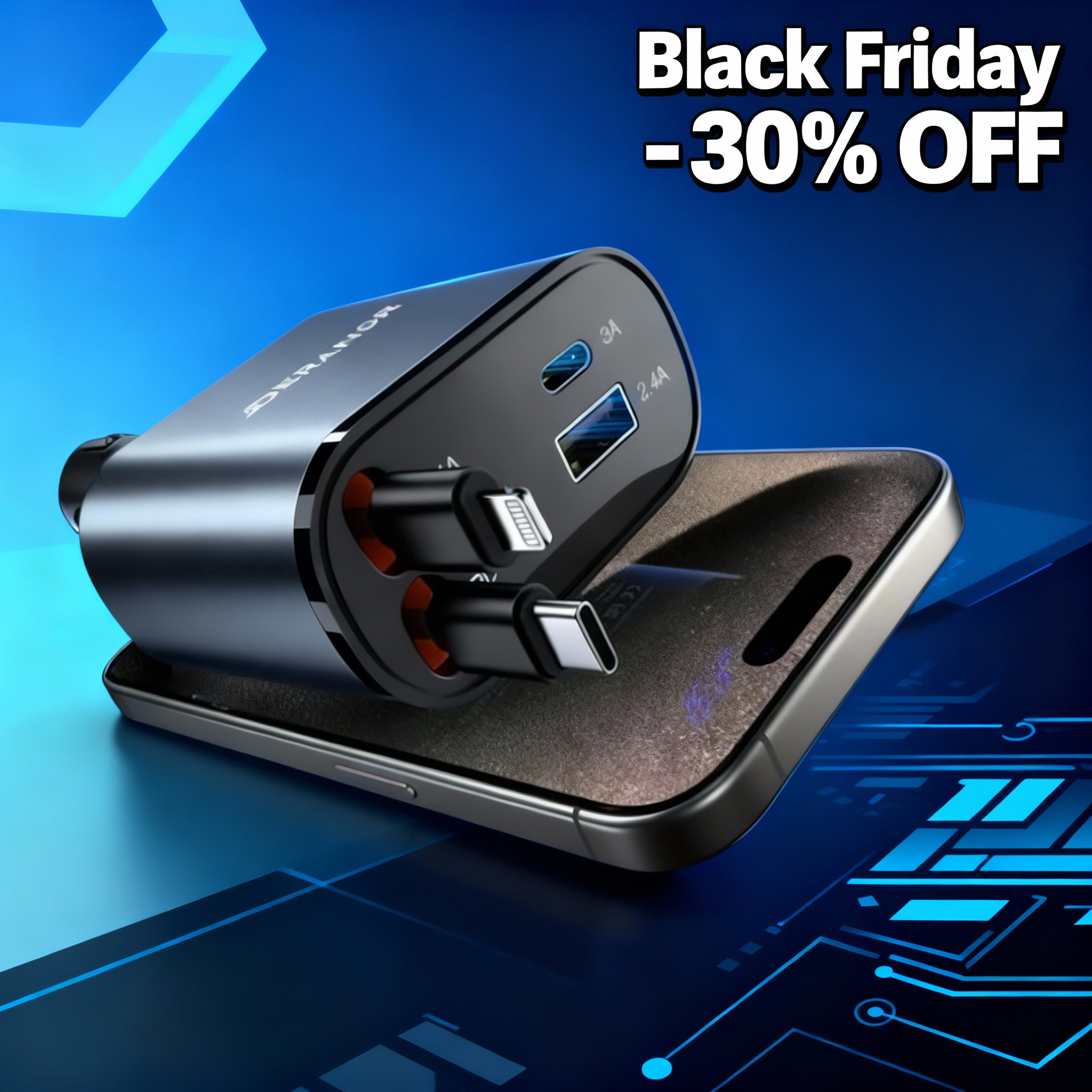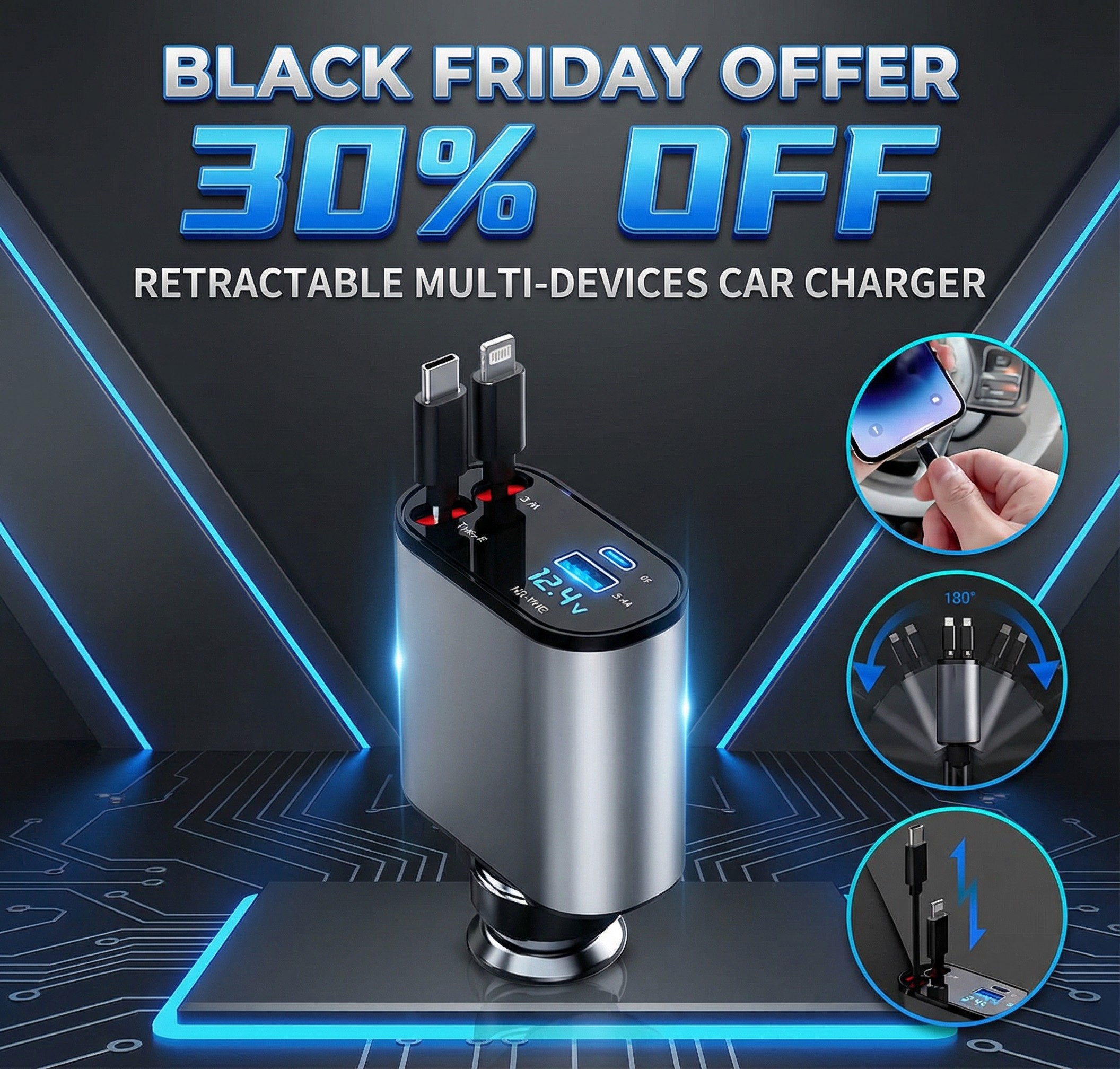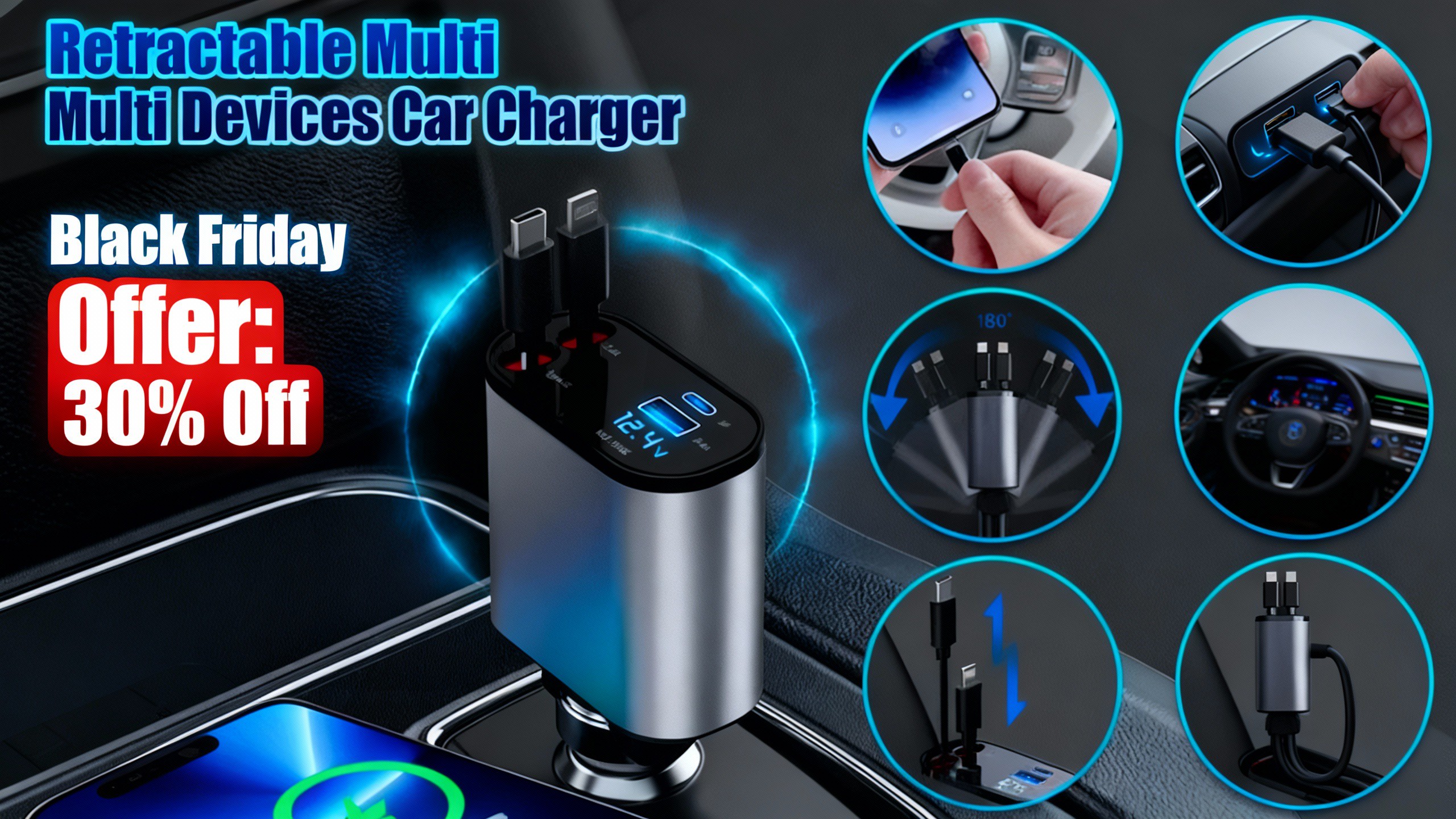 Ne laissez plus jamais une batterie vide gâcher vos trajets. Le chargeur voiture rétractable 4-en-1 haute vitesse a été conçu pour répondre aux besoins des conducteurs modernes : rapidité, praticité et organisation.